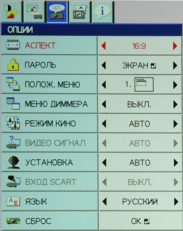 Если не указано обратное, то выбран профиль без коррекции цветовой температуры, включен режим BrilliantColor (или этот параметр имеет максимальное значение), включен режим высокой яркости лампы и объектив установлен на минимальное фокусное расстояние: