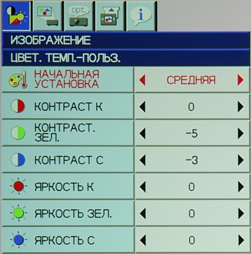 Стандартный набор настроек — КОНТРАСТ, ЯРКОСТЬ, ЦВЕТ. ТЕМП. (без коррекции, три встроенных профиля и настраиваемый профиль с регулировкой усиления и смещения трех основных цветов), ЦВЕТА (насыщенность), ТИНТ (имеется в виду оттенок) и ЧЕТКОСТЬ (контурная резкость) — дополнен установкой BrilliantColor, параметром, усиливающим четкость цветовых переходов (CTI), подстройкой уровней (ВХОДНОЙ УРОВЕНЬ) и настройкой деинтерлейсинга (РЕЖИМ КИНО).