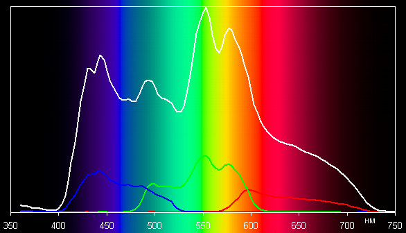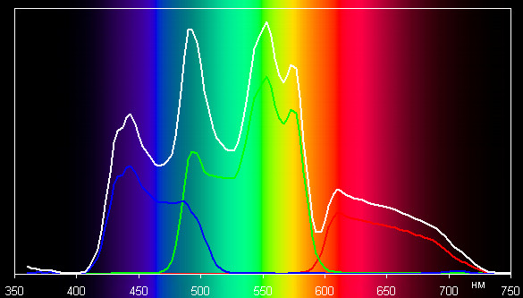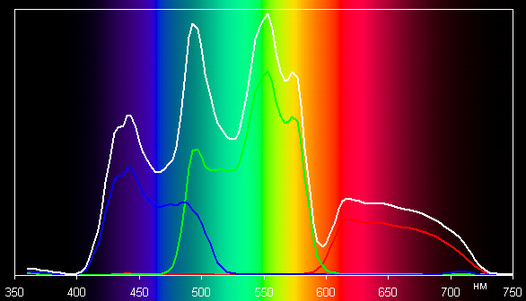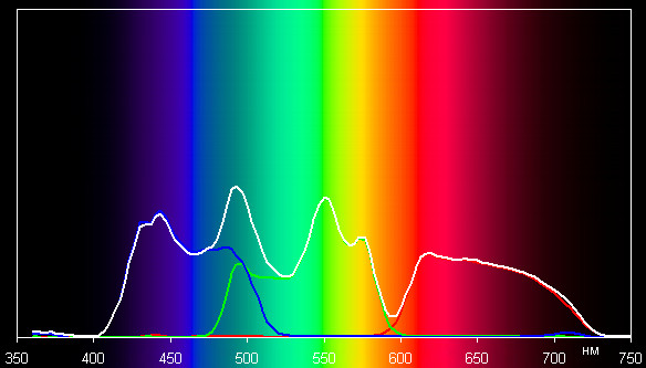 Ниже приведены два спектра белого поля (белая линия), наложенные на спектры красного, зеленого и синего полей (линии соответствующих цветов) при включенном режиме BrilliantColor и в кинотеатральном режиме с правильной цветопередачей и выключенном BrilliantColor (масштаб сохранен только для пар спектров, относящихся к одному проектору):