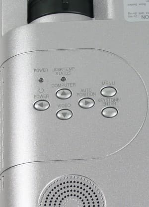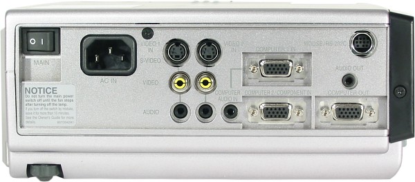 Группы VIDEO 1(2) IN имеют раздельные аудиовходы (гнездо 3,5 мм стереоминиджек), а на обе группы COMPUTER 1(2) IN — один аудиовход. Переключение между группами осуществляется или 4 кнопками на пульте, или кнопками COMPUTER и VIDEO на корпусе проектора. С помощью кабелей-переходников mini D-sub 15 pin на 3 RCA или на SCART к входу COMPUTER 2 IN можно подключить источник компонентного Y/Cb/Cr (Y/Pb/Pr) или RGBS(SCART)-видеосигнала, соответственно. Режим работы этого входа выбирается в меню. Внешняя звуковая система и монитор подключаются к выходам AUDIO OUT и COMPUTER OUT. Ручных настроек параметров VGA-сигнала необычно много (13!), но прибегать к ним необходимости нет, так как автоматика срабатывает быстро и правильно.