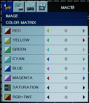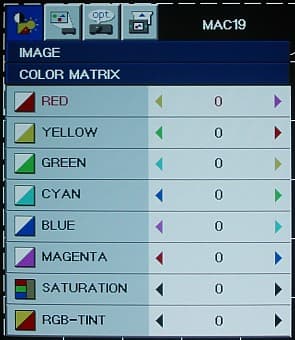 Параметр COLOR MATRIX отвечает за включение режима тонкой подстройки цветового баланса. Это предлагается делать, меняя значения 8 параметров, влияющих на интенсивность трех основных и трех дополнительных цветов, а также на баланс всех цветов.