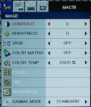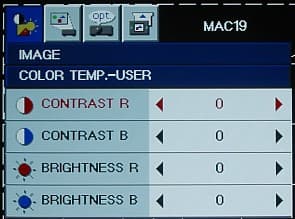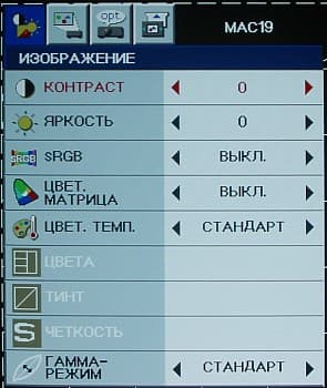 Настроек изображения много. Всегда можно отрегулировать яркость и контрастность. При активном подключении из группы VIDEO IN становятся доступными параметры, меняющие насыщенность, оттенок (для NTSC-сигнала) и контурную резкость. В списке GAMMA MODE выбирается тип коррекции кривой гаммы (DYNAMIC, STANDRD и THEATER), а в COLOR TEMP. — одно из предустановленных значений цветовой температуры (STANDRD, LOW и HIGH) или настроенный пользователем баланс синего и красного (с помощью параметров контраста и яркости красного и синего).