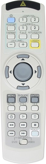 Наиболее часто используемые кнопки находятся прямо под большим пальцем. Большая кнопка-джойстик в центре служит только для управления курсором мыши, а для навигации по меню существуют отдельные 4 кнопки. Такое разделение функций понравится тем, кому трудно управлять кнопкой-джойстиком, но в результате курсорные кнопки оказались расположенными далеко друг от друга, а значит, скорость навигации по меню несколько снизилась. После подключения проектора к порту PS/2 или USB компьютера, появляется возможность управлять курсором мыши с пульта. При этом кнопка, расположенная снизу на пульте прямо под указательным пальцем, эмулирует левую кнопку мыши, а специальная кнопка сверху — правую кнопку мыши. В целом эмуляция мыши удобная, рисовать, конечно, не получиться, но при некоторой сноровке операции типа потащил-и-бросил осуществить можно. В пульт встроена лазерная указка, которая включается кнопкой LASER. Подсветки нет. Зато пульт можно научить командам другого пульта, например от DVD- или VHS-плеера. Для этого в нижней части пульта выделено 8 программируемых кнопок и переключатель DVD/VIDEO. Т.е. всего запоминается до 16 команд.
