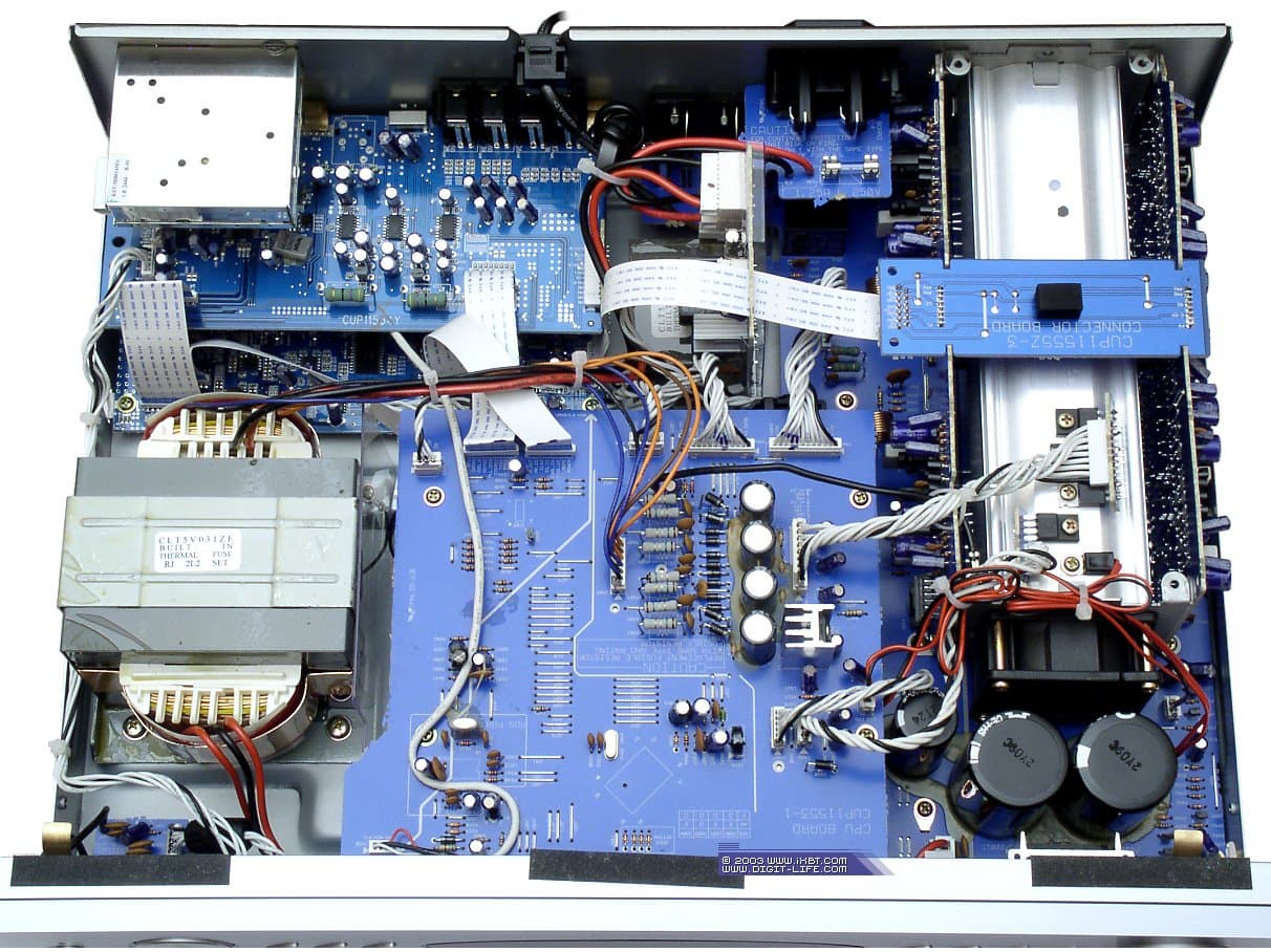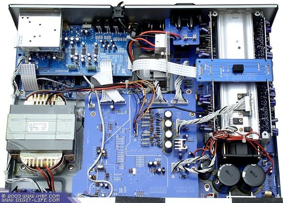 Качество сборки и монтажа компонентов не вызывает нареканий — всё сделано очень аккуратно и точно. Между верхней крышкой и корпусом проложены уплотнители из синтетической резины. В левой части аппарата расположен весьма внушительный трансформатор. Привод DVD/CD-дисков «спрятался» под центральной печатной платой. В правой части аппарата расположен алюминиевый радиатор охлаждения, свёрнутый в трубу, на конце которой стоит практически бесшумный кулер. Он включается при почти максимальной громкости, хотя практически не слышен даже в полной тишине на расстоянии 20-30 см (при закрытой верхней крышке аппарата, разумеется).