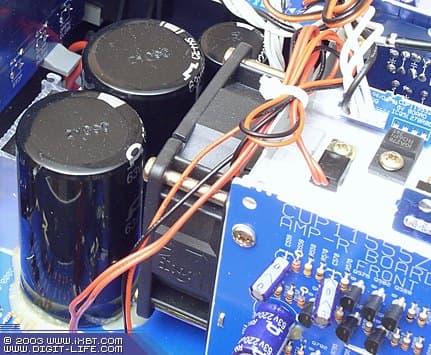 В сглаживающем фильтре питания используются два конденсатора по 15000 мкФ.