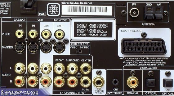 | Аналоговые | аудио: 1 стереовыход (магнитофонная «петля»), выход для наушников, выход предусилителя для сабвуфера. видео: 2 композитных RCA, 2 S-Video, 1 Scart (RGB) |