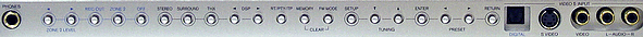 Здесь расположены кнопки управления и навигации по меню аппарата, кнопки управления радиоприёмником, а также некоторыми другими второстепенными функциями. Там же можно найти выход для наушников и фронтальные аудио- и видеовходы, а точнее 2 аудиовхода (оптический TosLink и аналоговый 2 RCA), 2 входа видеосигнала (S-Video и composite).