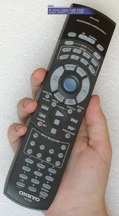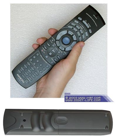 Пульт весьма функционален (есть программирование, «обучение», 2 макрокоманды) и неплохо лежит в руке. Но и минусы никуда не делись: довольно неудобный джойстик (синий «пятачок» в центре группы навигационных кнопок пульта как раз около большого пальца руки), отсутствие внутренней подсветки всех кнопок (подсвечиваются только 7 кнопок селектора входов) мешают назвать пульт по-настоящему эргономичным, ведь нет даже остаточного свечения кнопок. Поэтому пользоваться пультом придётся либо при свете, либо лишь на ощупь. А жаль, потому что в остальном «дистанционка» очень удобная.