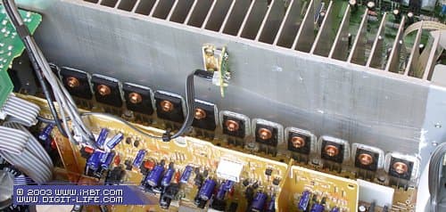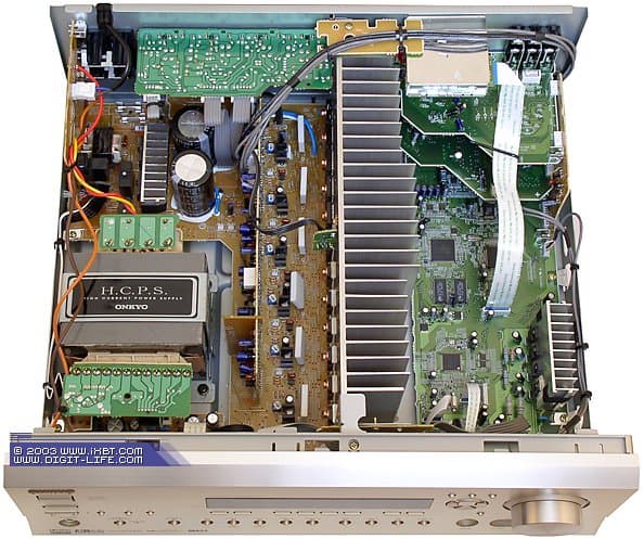 Внутренности TX-SR 701E как две капли воды похожи на «мозги» 601-й модели. Отличия конечно есть, просто они не бросаются в глаза: более «мускулистый» блок питания (на базе Ш-образного трансформатора Onkyo), другие полевые транзистотры (Toshiba 2SC5200 + 2SA1943 и Toshiba MN150S + MP150S), позволяющие усилителю развивать мощность 100 Вт на каждый канал (против 85 Вт у 601-й модели).