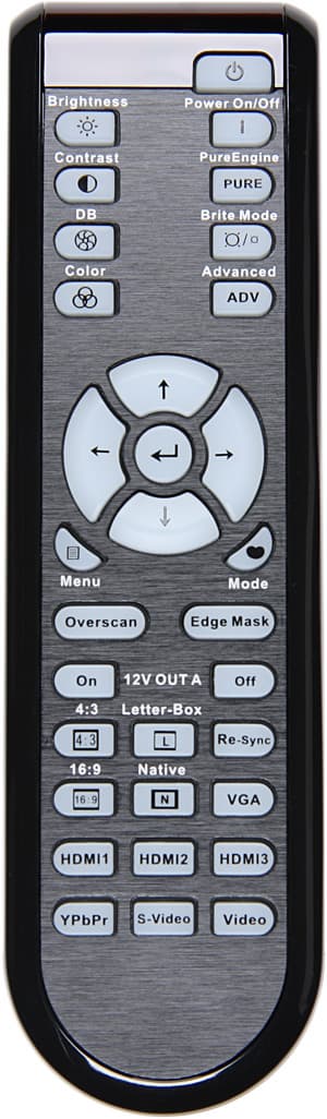 Проектор комплектуется двумя пультами: миниатюрным резервным и полноразмерным. Крохотный пульт предлагается хранить на самом проекторе в отведенном для него месте на задней панели, где он удерживается магнитом. Корпус этого пульта, разумеется, пластиковый, но в нем, очевидно, спрятана металлическая пластинка. Кнопки мембранные и на ощупь пользоваться пультом неудобно, впрочем, это неважно, так как основное предназначение резервного пульта заключатся в том, чтобы быть временной заменой в случае выхода из строя/потери основного пульта. Два пульта позволили разработчикам оставить на самом проекторе всего одну кнопку. Основной пульт удобно ложится в руку, кнопок на нем, пожалуй, даже избыток, они некрупные, подписи к ним мелковаты, однако блоком курсорных кнопок пользоваться удобно.