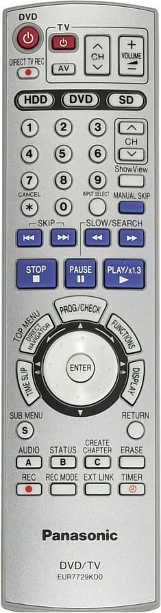 Изящные линии пульта привлекают к себе внимание, но в руке его держать как-то некомфортно: в нижней части он слегка толстоват, а верхняя очень узкая и гладкая снизу. Поэтому пульт все время намеревается выскользнуть из руки, а перехват его одной рукой в направлении от верхних кнопок к нижним превращается в жонглирование с непредсказуемым результатом. От полной неудовлетворенности спасают кнопки: они очень разные по форме и расположению, удачно использовано кодирование цветом, есть кнопки-качалки. В результате их функции легко запоминается, а нужная кнопка быстро находится на ощупь. Кнопка ENTER окружена многофункциональным диском. Вращение диска приводит (в зависимости от текущего состояния) к включению режимов перемотки, пошагового просмотра, перемещению по меню и т. д., а нажатие на края диска соответствует нажатию на курсорные кнопки. В целом пользоваться этим диском довольно удобно, нарекания вызывает только нечеткая фиксация поворота на следующий шаг. Пульт позволяет управлять телевизорами нескольких марок. Чтобы пульт не влиял на работу других аппаратов от Panasonic, ему и рекордеру можно присвоить один из трех кодов.
