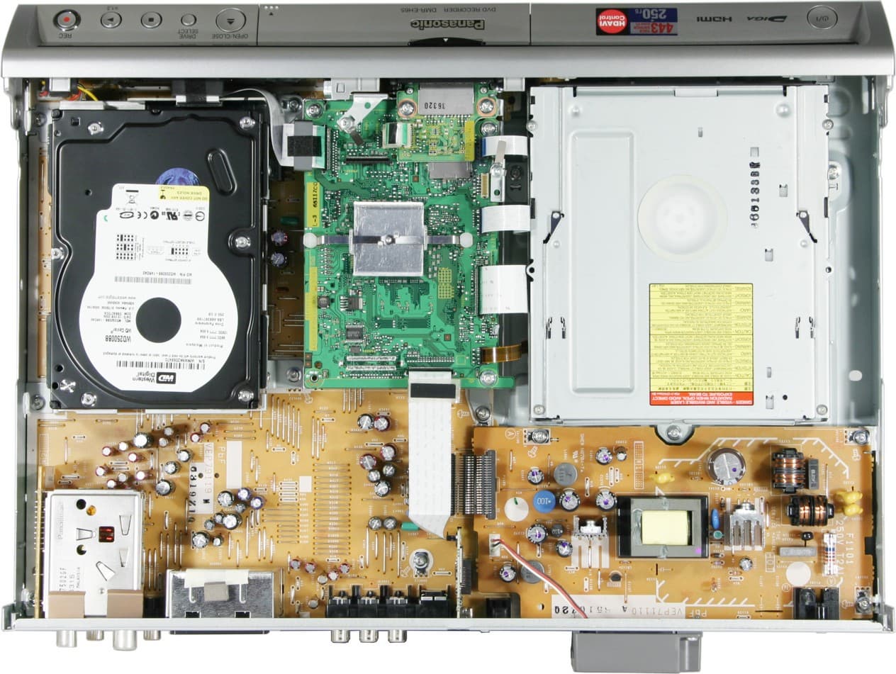 Электронные компоненты рекордера расположены на нескольких платах: больших, в полкорпуса, поменьше и совсем крохотных на пару чипов. В единое целое платы, DVD-привод и жесткий диск соединены шлейфами, шинами и кабелями. Главный чип прикрыт радиатором — маркировку не узнать. Другие, представляющие интерес чипы, расположены, видимо, на обратной стороне главной платы. Чтобы рассмотреть их, пришлось бы разобрать полрекордера, на что мы не могли пойти из-за сложности этой операции. В рекордере используется ТВ-РЧ-сборка от Panasonic. На стальном кронштейне жестко без демпфирующих прокладок закреплен жесткий диск WD2500BB (7200 об./мин, буфер 2 Мбайта, стойкость к удару 65 g/250 g при 2 мс (работа/выкл.), шум 28/33/29 дБА (простой, поиск режим 0, поиск режим 3)). Монтаж очень аккуратный.