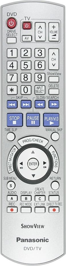 Пульт довольно большой, но не громоздкий. Цифровые кнопки и кнопки управления воспроизведением непривычно крупные, и имеют крупные и контрастные обозначения. Есть круглая четырехпозиционная навигационная кнопка с кнопкой выбора в центре и 3 кнопки качалки. Расположение кнопок, различие в форме и размерах, читаемые обозначения и ключевые пупырышки позволяют легко ориентироваться в кнопках пульта хоть на свету, хоть в полутьме и даже после некоторого привыкания в темноте. Пульт позволяет ограниченно управлять телевизорами нескольких марок (предустановленные профили). Чтобы пульт не влиял на работу других аппаратов от Panasonic, нужно согласованно поменять код (3 шт.) пульта и рекордера.