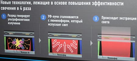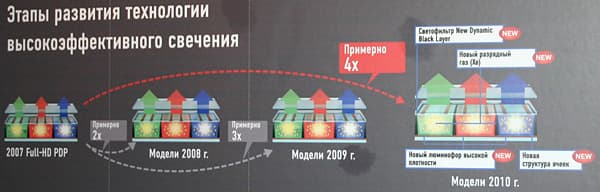 В новых панелях разрядный газ содержит ксенон, используется люминофор высокой плотности, уменьшены промежутки между ячейками и уменьшена площадь электродов.