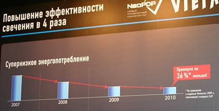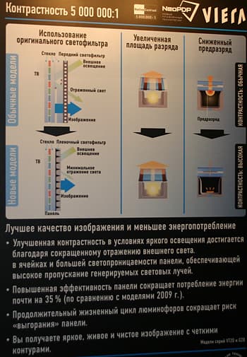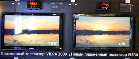 На одном из стендов экономичность новых плазменных телевизоров подтверждалась индикаторами потребляемой мощности. Впрочем, потребление электроэнергии имеет сложную зависимость от яркости и общей освещенности текущей сцены, что затрудняет прямое сравнение. Кроме того, после визуального выравнивания яркости панелей разница в потреблении несколько уменьшается: