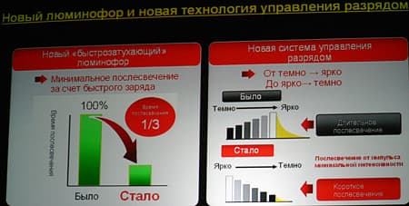 Уменьшение времени послесвечения достигнуто как за счет нового быстрозатухающего люминофора, так и за счет изменения последовательности импульсов.