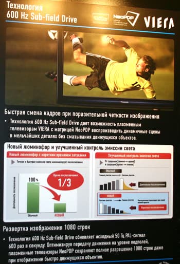 Для наглядного сравнения на стенде, посвященном технологии 600 Hz Sub-field Drive стояли ЖК- и плазменный телевизоры конкурентов, плазменный ТВ серии G и представитель серии VT20 — VIERA TX-PR50VT20. На последнем тестовые миры и объекты в движении выводились с потрясающей четкостью и практически не имели зеленоватого хвоста, только при ближайшем рассмотрении можно было увидеть едва заметный зеленоватый контур. Также изображение VT20 отличалось очень высокой реальной контрастностью. На ее увеличение работают два фактора: уменьшенный предразряд, благодаря чему черные ячейки практически не светятся, и специальный фильтр, уменьшающий отражение внешнего света.
