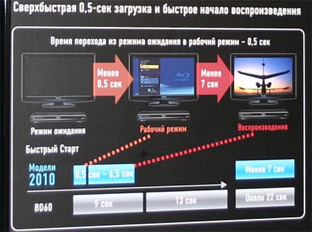 К технологиям, увеличивающим удобство использования, относится и функция быстрой загрузки, реализованная в новых Blu-ray-плеерах Panasonic. Если плеер находится в этом режиме, то из состояния ожидания он включается за 0,5 с, а загружает диск за 6,5 с.