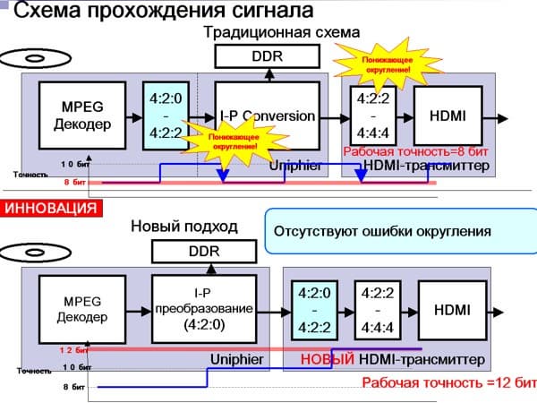 Результатом декодирования видеопотока с Blu-ray-диска являются кадры (или поля в случае чересстрочного сигнала) с уменьшенным разрешением по цвету как по горизонтали, так и по вертикали (формат 4:2:0), с точностью 8 бит на цвет (и в диапазоне 16-235). Для передачи изображения на устройство воспроизведения нужно увеличить разрешение по цвету как минимум по вертикали (до 4:2:2) и, желательно по горизонтали (до 4:4:4), а также выполнить прогрессивное преобразование. Оказывается, имеет значение последовательность действий. В новых плеерах Panasonic сначала выполняется прогрессивное преобразование, а затем преобразование 4:2:0 в 4:2:2. Это позволяет увеличить точность восстановления цвета на уровне отдельных пикселей. Кроме того, теперь на каждом этапе битность сигнала только увеличивается, что снижает ошибки округления.