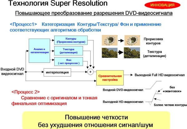 Улучшению четкости и достоверности цветовых переходов способствует адаптация к контурам на стадии преобразования 4:2:2 в 4:4:4. Положительный эффект от этой функции будет заметен даже в случае прогрессивного видео, т.е., например, в случае кинофильмов. Не забыт и старый добрый DVD-Video. С помощью специального процесса, совмещающего восстановление цветовой информации и увеличение разрешения до Full HD, увеличение четкости выполняется с учетом особенности изображения.