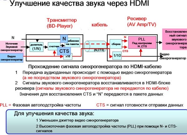 HDMI является универсальным интерфейсом, по которому передаются видео и аудиосигналы в цифровом виде. (Заметим, что в плеере DMP-BDT300 есть два HDMI-выхода, второй, версии 1.3 предназначен специально для подключения к ресиверам, не поддерживающим версию 1.4.) Казалось бы, все просто, цифровой поток на входе — цифровой поток на выходе, но для точного восстановления аудиосигнала, вернее звукового синхрогенератора нужно предпринимать некоторые специальные действия, которые теперь выполняются в новых плеерах Panasonic.