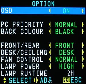 В меню установок отключается вывод названия типа подключения при смене сигнала (пункт OSD); выбирается цвет фона при отсутствии сигнала (в пункте BACK COLOUR из черного и синего). Как это ни странно, выбранный цвет будет присутствовать по бокам изображения при проецировании картинки формата 4:3. Есть возможность включить повышенную скорость вращения вентилятора (FAN CONTROL) и пониженную яркость лампы (LAMP POWER). В руководстве есть туманный намек на то, что если проектор эксплуатируется в режиме пониженной яркости, то он будет просить заменить лампу позже, но насколько конкретно не сказано.