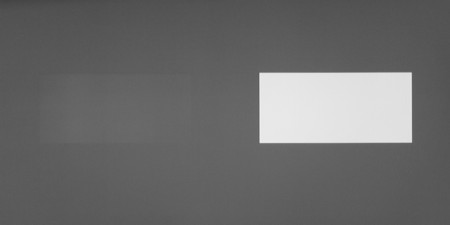 Для тестирования эффективности разделения для глаз мы вывели три тестовых изображения с черным прямоугольником на белом фоне, с белым прямоугольником на черном фоне и со светло-серым прямоугольником на темно-сером фоне. В стереопарах прямоугольники были смещены относительно друг друга, поэтому при просмотре через очки при 100%-ном разделении можно было бы видеть только один прямоугольник. Фотографии ниже сделаны через очки, при этом экспозиция подбиралась так, чтобы белое поле на фотографиях было максимально ярким, но еще не пересвеченным.
