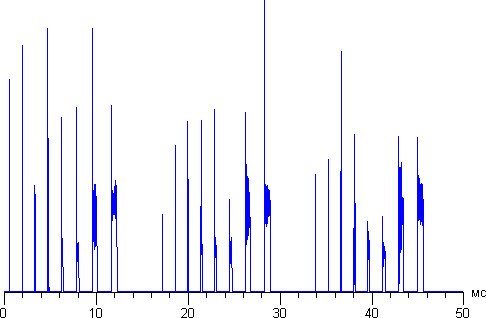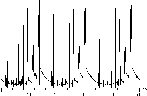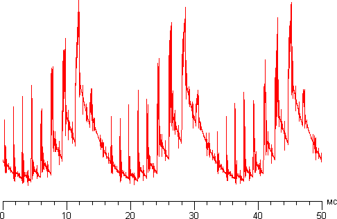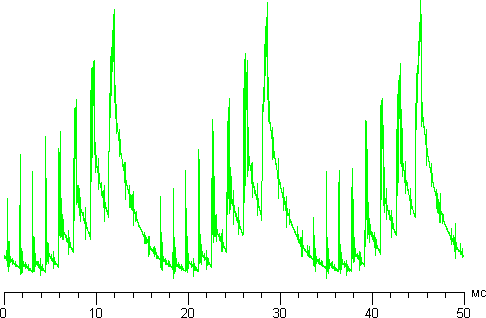 При подаче сигнала с 60 кадр/с группы импульсов следуют с частотой 60 Гц по 8-10 импульсов в группе от короткого к длинному. Светимость синего люминофора практически сразу спадает до 0, тогда как красный и зеленый люминофоры имеют заметное послесвечение: