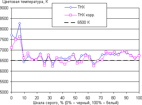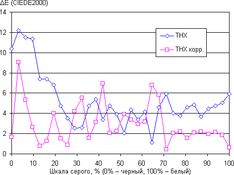 Из предустановленных режимов цветопередача ближе всего к стандартной в режиме THX. Графики ниже показывают цветовую температуру на различных участках шкалы серого и отклонение от спектра абсолютно черного тела (параметр дельта E) в оригинальном режиме THX и после незначительной коррекции усиления основных цветов: