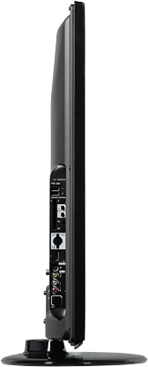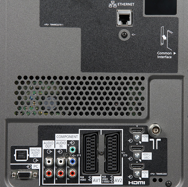 Комплектный пластиковый хомут с фиксатором, вставляемым в отверстие на задней панели, поможет стянуть отходящие кабели в аккуратный пучок. На задней панели находятся 4 резьбовых отверстия для монтажа на настенном кронштейне и многочисленные вентиляционные решетки. Охлаждение полностью пассивное. При взгляде снизу на нижней грани можно обнаружить решетки, за которыми находятся громкоговорители с овальными диффузорами. Эти широкополосные громкоговорители закреплены на резиновых демпферах и через прокладку из пористой резины прижаты к днищу. Основание штатной подставки закрыто черной пластиковой накладкой с не очень устойчивой к царапинам зеркально-гладкой поверхностью. Снизу основание усилено толстой стальной пластиной, на которую наклеены резиновые площадки. Стойка подставки изготовлена из магний-алюминиевого сплава и тремя винтами прикручивается к пьедесталу на основании. Блок экрана насаживается на два рога стойки и фиксируется на ней четырьмя винтами. Телевизор стоит на подставке устойчиво и строго вертикально.