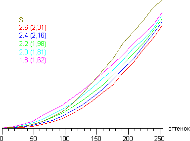 Параметр Гамма в настройках изображения влияет на характер кривой гамма-коррекции. Так как изображение плазменного телевизора отличается некоторой динамикой, то наш тест с замером яркости 256 оттенков с усреднением по 0,5 с на каждый оттенок дал неудовлетворительные результаты. Увеличивать время теста мы посчитали нерациональным, поэтому ограничились замером яркости 17 оттенков с усреднением по 2 с: