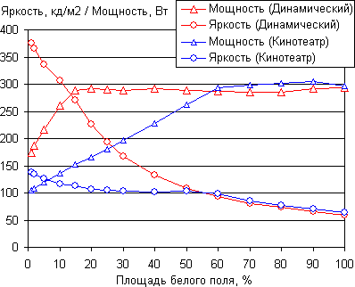 Видно, что в режиме Динамический яркость по возможности сохраняется максимальной, а в режиме Кинотеатр яркость меняется не так сильно. Однако при достижении площади белого в 60% различие между этими двумя режимами становится минимальным. При белом поле во весь экран в режиме Кинотеатр яркость равна 64 кд/м², а потребление — порядка 296 Вт. В режиме ожидания потребление составило порядка 0,6 Вт, а когда телевизор выключен кнопкой на корпусе, он потребляет те же 0,6 Вт.