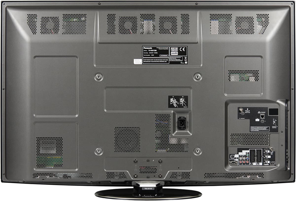 Разъем питания расположен отдельно ближе к центру. Ориентированы разъемы назад, перпендикулярно экрану. Фирменный кабель питания оканчивается г-образным разъемом и оборудован специальной пластиковой защелкой, предотвращающей выпадение. Пара комплектных пластиковых хомутов с фиксаторами, вставляемыми в отверстия на задней панели, помогут стянуть отходящие кабели в аккуратный пучок. На задней панели находятся 4 резьбовых отверстия для монтажа на настенном кронштейне и многочисленные вентиляционные решетки. Пассивное охлаждение усилено четырьмя вентиляторами, расположенными в верхней части корпуса. При взгляде снизу на нижней грани можно обнаружить решетки, за которыми находятся громкоговорители с овальными диффузорами. Эти широкополосные громкоговорители закреплены на резиновых демпферах и через прокладку из пористой резины прижаты к днищу. Еще один круглый низкочастотный громкоговоритель расположен за квадратной решеткой на задней панели, и отделен от нее прокладкой из поролона. Заметим, что блок экрана этого телевизора на 3,5 кг легче, но чуть-чуть толще, чем блок экрана у TX-PR50V10.