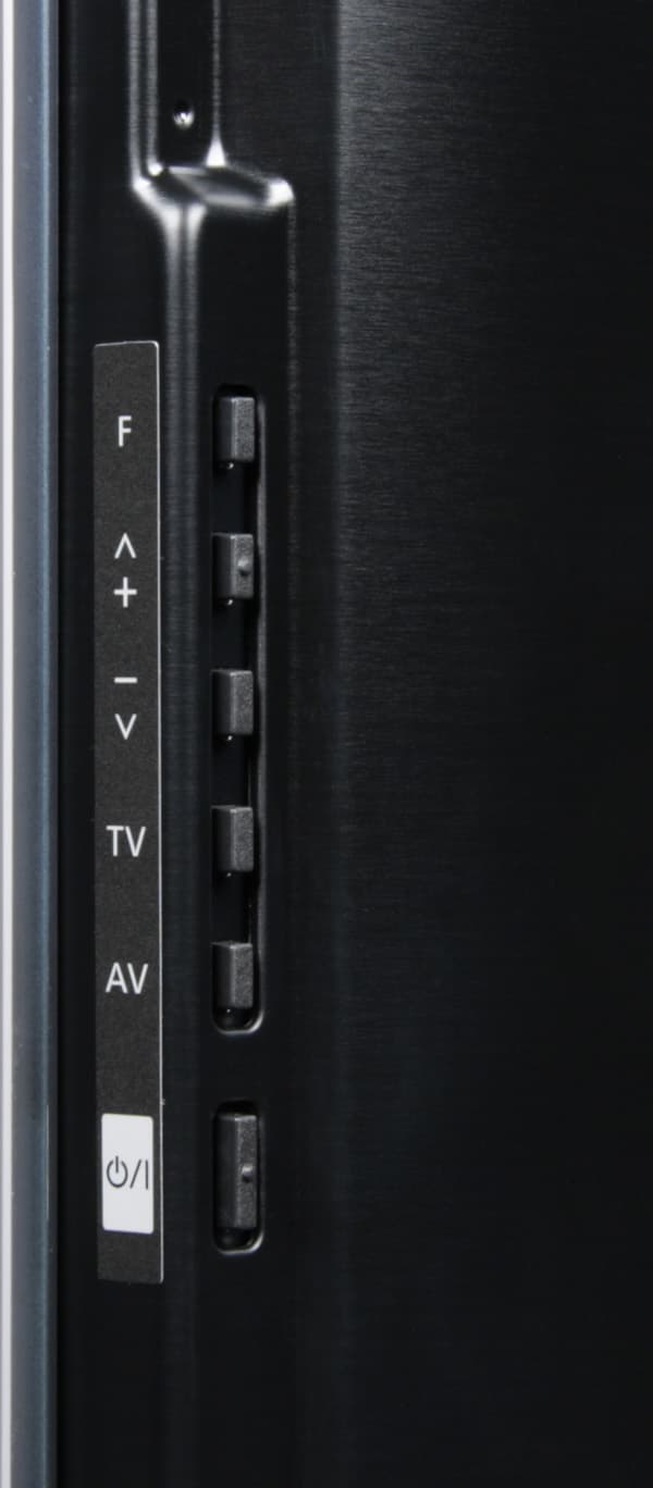 В нижней части экрана между фронтальной панелью и нижним торцом с небольшим заглублением размещена вставка из черного пластика с зеркально-гладкой поверхностью. Помимо группы логотипов на этой вставке размещаются едва заметные узкие щели фронтальных громкоговорителей, датчик освещенности, индикатор состояния (неяркий, светится красным в режиме ожидания, зеленым — при работе, и мигает, когда телевизор принимает сигналы с пульта) и ИК-приемник сигналов с ПДУ. Дополнительный низкочастотный громкоговоритель размещен в отдельном корпусе-резонаторе, который вынесен на заднюю панель. Кожух, прикрывающий заднюю панель, выштампован из тонкого листа жести и имеет матовое черное покрытие.