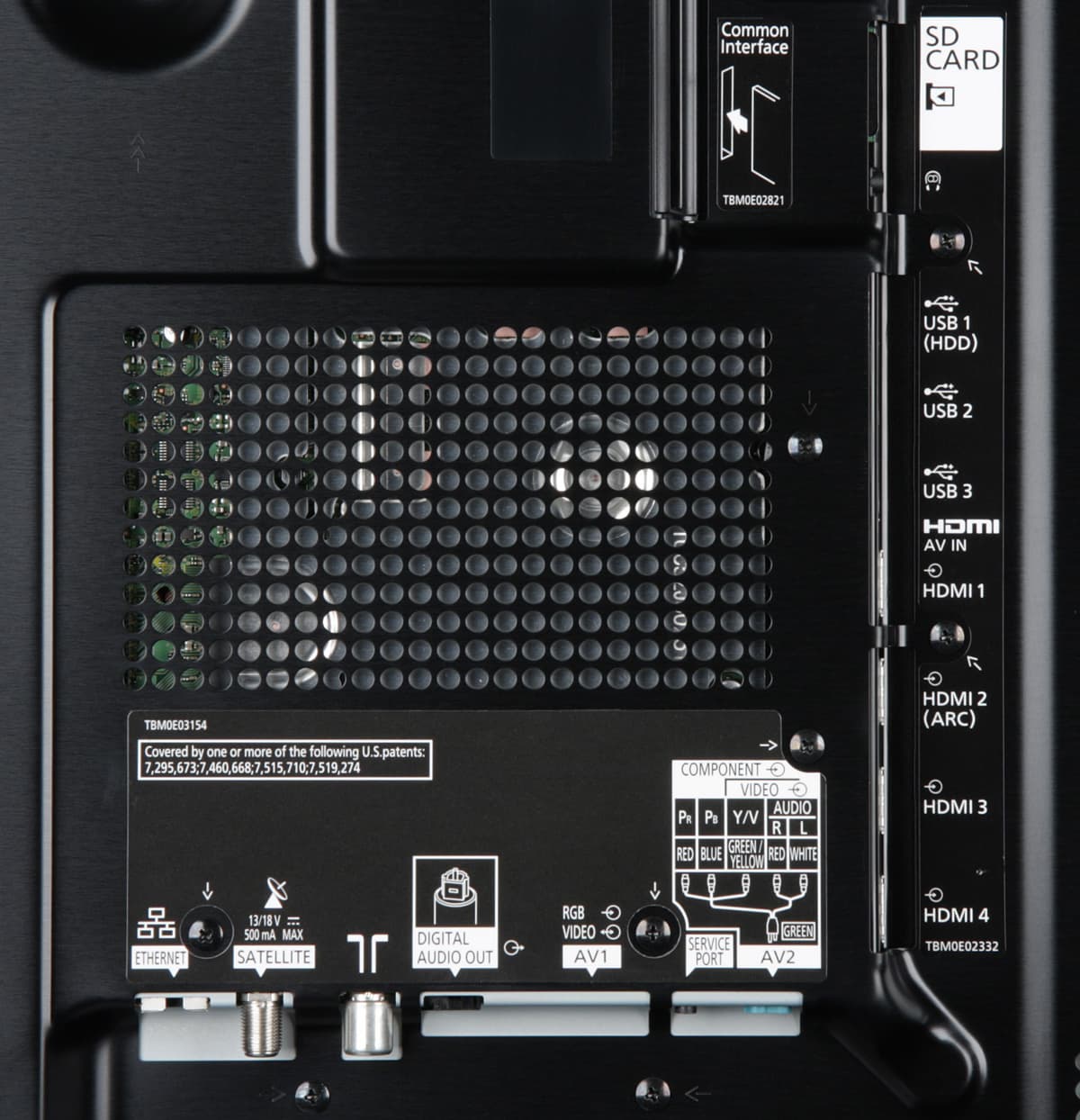 Также на задней панели есть четыре прикрытых пластиковыми заглушками резьбовых отверстия для монтажа на настенном кронштейне и многочисленные вентиляционные решетки. Прогонять через них воздух помогают два небольших вентилятора, расположенные в верхней части кожуха. Основание штатной подставки сверху закрыто серо-серебристой пластиковой накладкой с зеркально-гладкой, видимо ламинированной, поверхностью и имеет окантовку из пластика с серебристым покрытием. Снизу основание усилено толстой стальной пластиной, на которую наклеены резиновые площадки. Стойка подставки изготовлена из магний-алюминиевого сплава и прикрыта накладками из пластика с серебристым покрытием. На стойке закрепляется кронштейн из стального профиля, на который крепится собственно блок экрана. Сверху кронштейн закрывается декоративной крышкой из черного пластика с матовой поверхностью. Телевизор стоит на подставке устойчиво и строго вертикально.