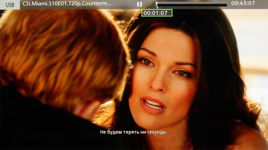 По результатам тестирования с помощью нашей подборки видеофайлов (с аудио- и графическими файлами проблем не было никаких) можно утверждать, что столкнуться с невозможностью воспроизведения видеофайла встроенным в телевизор плеером в принципе реально, но вероятность этого низкая. Из приятных моментов отметим наконец-то появившуюся поддержку внешних текстовых субтитров в русской кодировке Win1251 (или CP-1251, также поддерживаются ISO8859-5 и Unicode (UTF-8)).