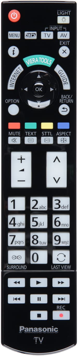 Пульт используется в точности такой же, которым комплектуется телевизор Panasonic VIERA TX-LR42DT50. Черный пластиковый корпус пульта состоит из двух половинок — верхняя имеет зеркально-гладкую поверхность (неустойчивую к появлению царапин), нижняя — матовую. Форма корпуса пульта эргономичная, а расположенные вдоль корпуса элементы питания улучшают балансировку. Часто используемые кнопки выполнены большими и имеют крупные контрастные обозначения. Пульт оснащен двумя ИК-излучателями: один направлен вперед, другой вперед и вниз, что позволяет держать пульт направленным немного вверх — так удобнее, и обозначения кнопок лучше видно. Большая часть кнопок оснащена достаточно яркой и равномерной светодиодной подсветкой, включающейся фосфоресцирующей кнопкой LIGHT. Выключается подсветка ей же или через несколько секунд после последнего нажатия на кнопки. Подсветка значительно облегчает использование пульта в темном помещении.