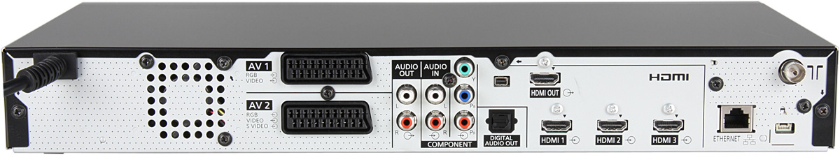 В поднятом положении крышка не мешает индикаторам состояния и занятости слота SD, а также не препятствует включению/выключения тюнера кнопкой питания. На задней панели находятся остальные разъемы и вентиляционная решетка, через которую небольшой вентилятор выдувает теплый воздух.