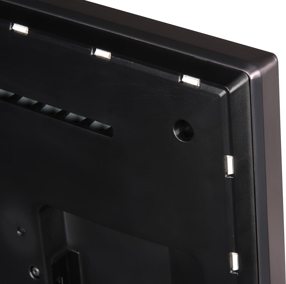 Узкая рамка экрана изготовлена из алюминиевого сплава, снаружи анодированного и с серым оттенком. Поверхность рамки по периметру зеркально-гладкая, а спереди — матовая с грубой шлифовкой. Ширина рамки с боков и сверху 13 мм, снизу — 15 мм, при этом область изображения на экране почти совпадает с внутренней границей рамки. Снизу по центру есть объемная накладка из пластика, верхняя плоскость которой имеет хромированное блестящее покрытие, которое может отражать верхний свет. На накладке размещен логотип из белых букв. Логотип с подсветкой, но ее можно отключить. Внешняя поверхность матрицы жесткая, зеркально-гладкая, но слегка неровная. При этом очень эффективный антибликовый фильтр снижает яркость отраженных объектов до такой степени, что зеркальность экрана просмотру не мешает, если только прямо напротив экрана нет очень ярких точечных источников света. Корпус по современным меркам нельзя назвать очень тонким, так как в верхней части его толщина составляет примерно 37 мм, а в нижней — 57 мм.