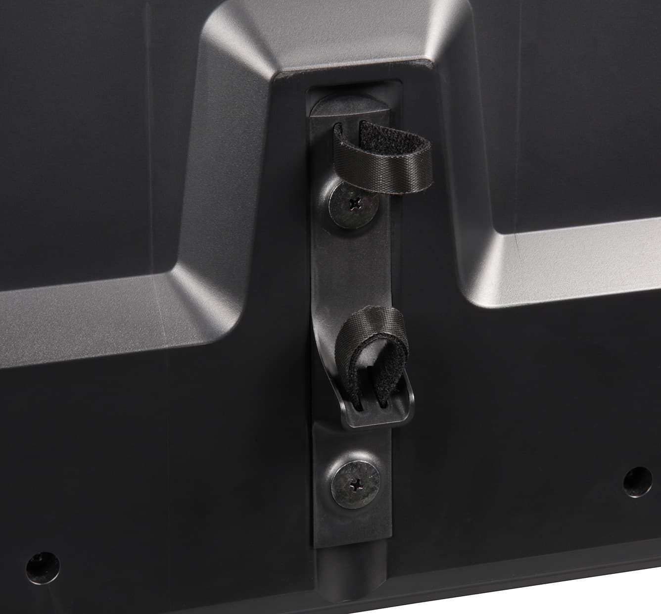 Мнения на ее счет расходятся, кто-то разок включает, чтобы не включать больше никогда, кому-то нравится. В общем, рекомендуем попробовать в деле все режимы и настройки ее работы, прежде чем прийти к окончательному выводу. Интерфейсные разъемы расположены в трех группах: часть — в мелкой нише на задней панели и ориентированы назад, часть — в нише ниже и ориентированы вниз, а часть — в нише ближе к левому торцу и ориентированы вбок. Разъем для кабеля питания находится в еще одной небольшой нише и ориентирован вниз. Организовать отходящие кабели в аккуратный пучок поможет кронштейн с двумя хомутами из лент-липучек, закрепляемый на задней панели внизу по центру.