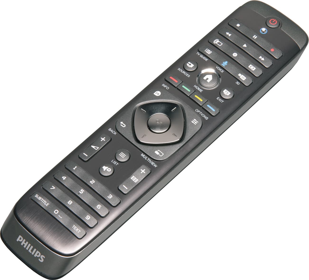 Корпус пульта изготовлен в основном из пластика, с темно-серым матовым серебристым покрытием по периметру, снизу с черным и тоже матовым. Верхняя панель — это пластина из алюминиевого сплава, анодированная, тонированная и с фактурой грубой шлифовки — в общем, в стиле фронтальной рамки телевизора. Кнопок на пульте много, в основном они из упругого пластика. Пульт большой, очень тяжелый (205 г) и очень продвинутый. На нижней плоскости пульта расположена QWERTY-клавиатура.