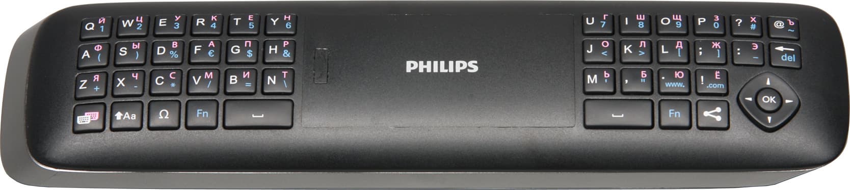Кнопки клавиатуры имеют альтернативную функцию и второй набор символов, в данном случае это кириллица, поэтому кроме кнопок переключения регистра, есть и функциональная кнопка и кнопка переключения раскладки. Между двумя группами кнопок находится крышка отсека для элементов питания, хотя туда просится тач-панель. Впрочем, ее функция возложена на гироскопический датчик. Если положить палец на кнопку OK, но не нажимать на нее, то активируется функция двухкоординатной указки по типу компьютерного манипулятора «мышь». Поворот пульта относительно его центра верх-вниз и вправо-влево вызывает перемещение курсора по экрану в соответствующем направлении. Эта указка поддерживается в интерфейсе телевизора и во многих встроенных приложениях. В некоторых из последних, например в браузере, использовать такую «мышь» действительно удобно, но в остальных случаях, например, перемещаться по меню быстрее с помощью курсорных кнопок. К тому же указка постоянно сбивается, так как она не привязана к абсолютному положению пульта в пространстве, приходится подправлять ее, «упирая» курсор в край экрана. Этот пульт работает по радиочастотному каналу, однако сохранена совместимость и с ИК-пультами — на фронтальной рамке телевизора внизу справа есть окошко ИК-приемника. С точки зрения возможности интеграции в систему умного дома это полезно, опять же, если куда-то денется штатный пульт найти ему недорогую замену будет не очень сложно.