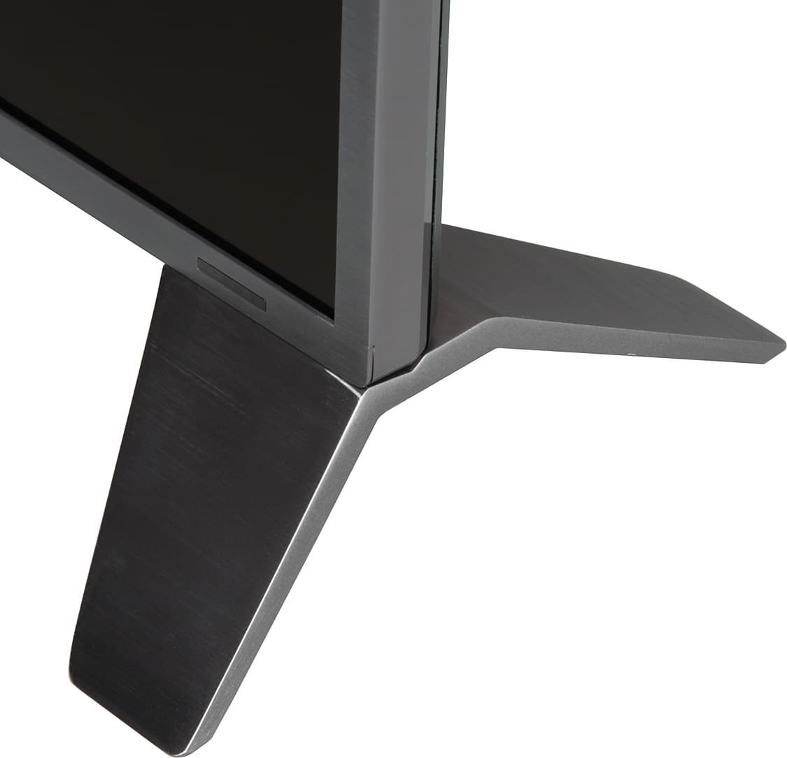Подставка — это две V-образные стойки, которые винтами прикручиваются к нижней грани рамки. Как и рамка, стойки изготовлены из легкого сплава. Снизу на опорные плоскости стоек приклеены резиновые накладки. Конструкция простая, жесткость высокая, телевизор стоит устойчиво и чуть наклонен назад. Смотрится все это строго и аккуратно. Однако стойки выходят за ширину самого телевизора, поэтому для него потребуется более широкая ниша, и, кроме того, телевизор уже нельзя поставить на стол или тумбу, которые уже его самого.