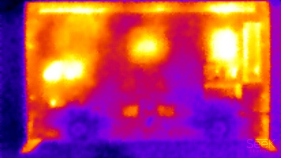 Нагрев телевизора можно оценить по приведенному ниже ИК-снимку задней панели, полученному после долговременной работы на максимальной яркости в помещении с температурой примерно 24 °С (ближе к белому — выше температура):