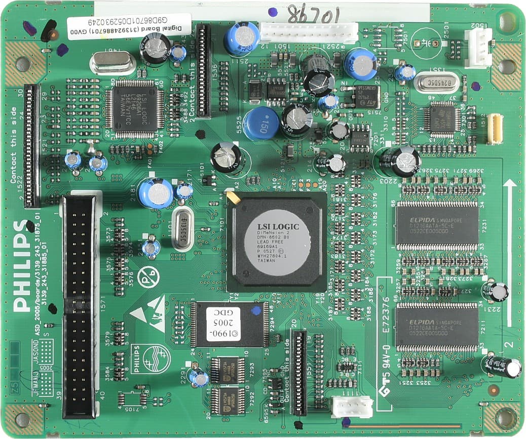 Главным чипом в рекордере является популярный мультимедийный процессор DMN-8602 от LSI Logic. Он несет большую часть функциональной нагрузки, в частности, кодирует в MPEG2, декодирует MPEG2- и MPEG4-потоки, предоставляет несколько типов интерфейсов для работы с периферийными устройствами, также в него интегрированы видеоЦАПы. За аналого-цифровое преобразование видеосигнала и его декодирование отвечает микросхема L2146 тоже от LSI Logic.