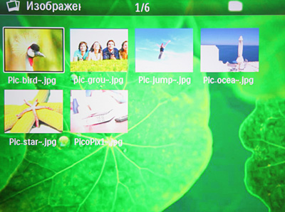 В проекторе есть встроенный браузер, который позволяет просматривать содержимое встроенной памяти, подключенных USB-носителей и вставленных карт SD. Между этими накопителями можно переключаться кнопкой возврата, находясь в главном меню. Папки и файлы можно копировать и удалять.