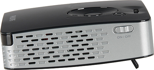 С прижатой ножкой из-за выпуклого днища проектор лежит на ровной плоскости неустойчиво, поэтому при проекции со стола лучше или откидывать ножку (но проекция при этом будет направлена вверх), или закрепить проектор на миниатюрном штативе, входящем в комплект поставки. Также в комплекте поставки есть чехол с двумя жесткими стенками, куда с трудом втискивается проектор и ничего больше не влезает.
