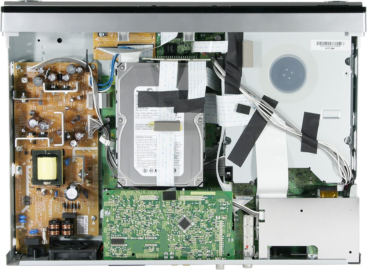 Рекордер набит электроникой как портативный компьютер. Мы посчитали, что за приемлемое время, сохраняя при этом низкий уровень вероятности невозврата рекордера в рабочий вид, у нас не получится разобрать рекордер и выявить все компоненты, представляющие интерес. Недеструктивными методами удалось обнаружить и определить, что в рекордере используются две РЧ-сборки для аналогового и цифрового ТВ, NICAM декодер от MICRONAS (MSP3417G), HDMI-трансмиттер SiI9030CTU от Silicon Image, чипы от NEC в DV-интерфейсе, микросхема аудиоЦАП PCM1742KE (192 кГц/24 бит, 106 дБ динамического диапазона, THD+N = 0.002%), аудиоАЦП AKM5359ET (S/(N+D) = 94 дБ, DR = 102 дБ), жесткий диск Seagate ST3500841ACE, DVD-привод VWT1235. Монтаж очень аккуратный, некоторые платы экранированы, шлейфы и провода закреплены. Теплый воздух из рекордера выдувает относительно большой тихий вентилятор, который работает как минимум на двух скоростях.