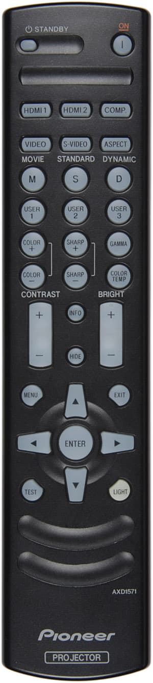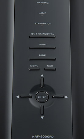 Пульт не очень большой. Его корпус изготовлен из черного пластика с матовой поверхностью. Кнопок много, однако, пульт очень удобен в использовании. Форма эргономична, самые нужные кнопки легко находятся на ощупь, две самые востребованные при настройке изображения функции — регулировки яркости и контрастности — вынесены на большие кнопки-качалки, есть кнопки непосредственного выбора входов и профилей. Некоторые подписи, правда, мелковаты. Есть достаточно яркая и равномерная светодиодная подсветка, включающаяся фосфоресцирующей кнопкой LIGHT. Включение и выключение проектора разнесены на две кнопки.