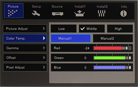 в проекторе есть регулировка цветовой температуры (3 предустановленных и 2 пользовательских профиля с регулировкой усиления цветовых компонент),